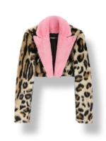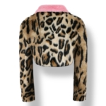 ג׳קט פרווה קצר בעיצוב נועז המשלב הדפס מנומר עם צווארון פרווה ורוד בגימור רך ויוקרתי.