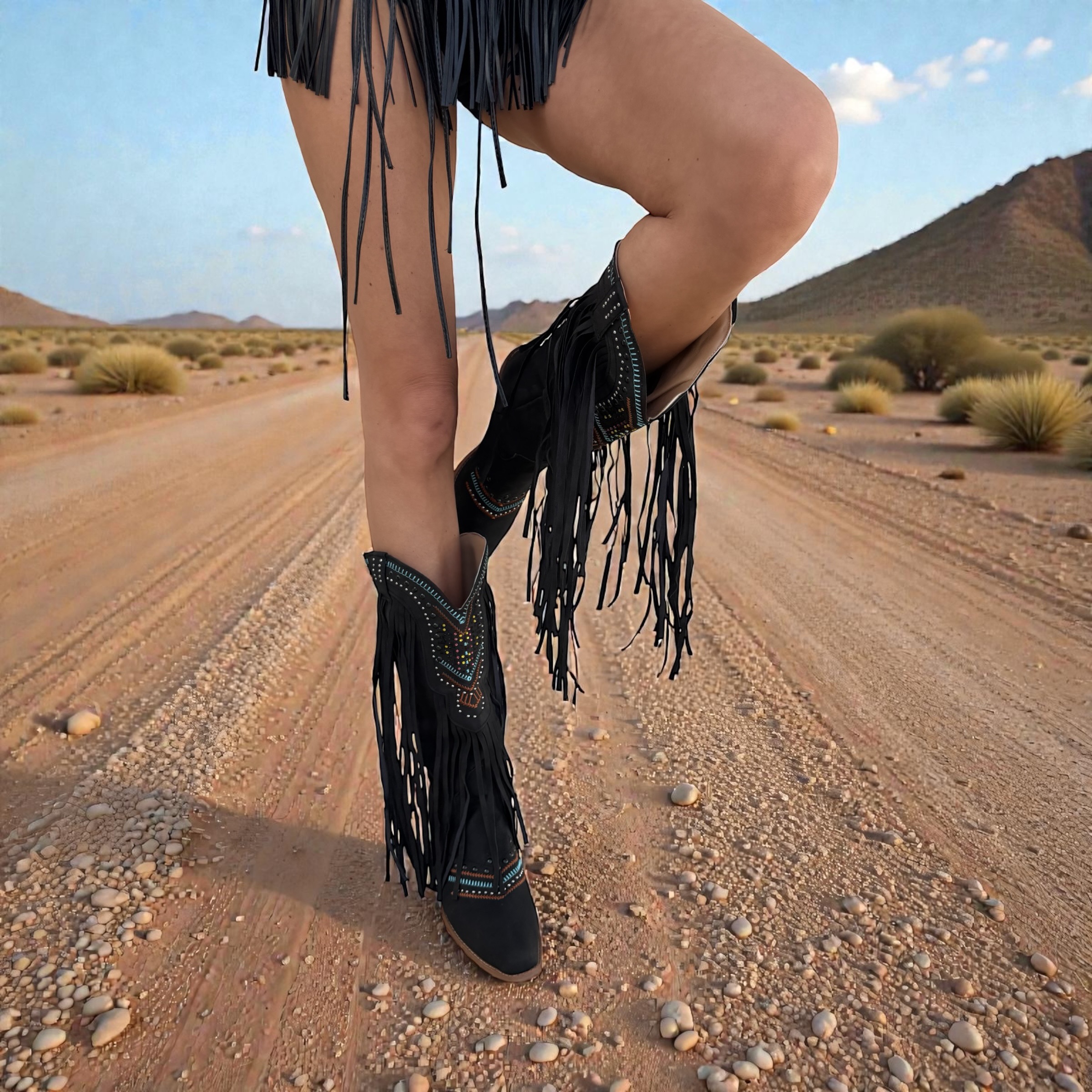 מגפי סטייטמנט בסגנון בוהו-פסטיבל, בעיצוב גבוה עם פרנזים ארוכים היוצרים תנועה מרשימה בכל צעד.