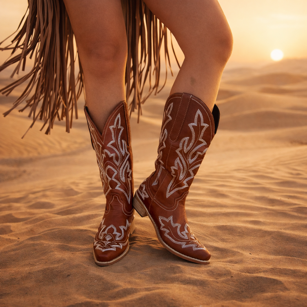 מגפי Western Glow בעיצוב קאובוי קלאסי עם טוויסט נשי ועדכני.