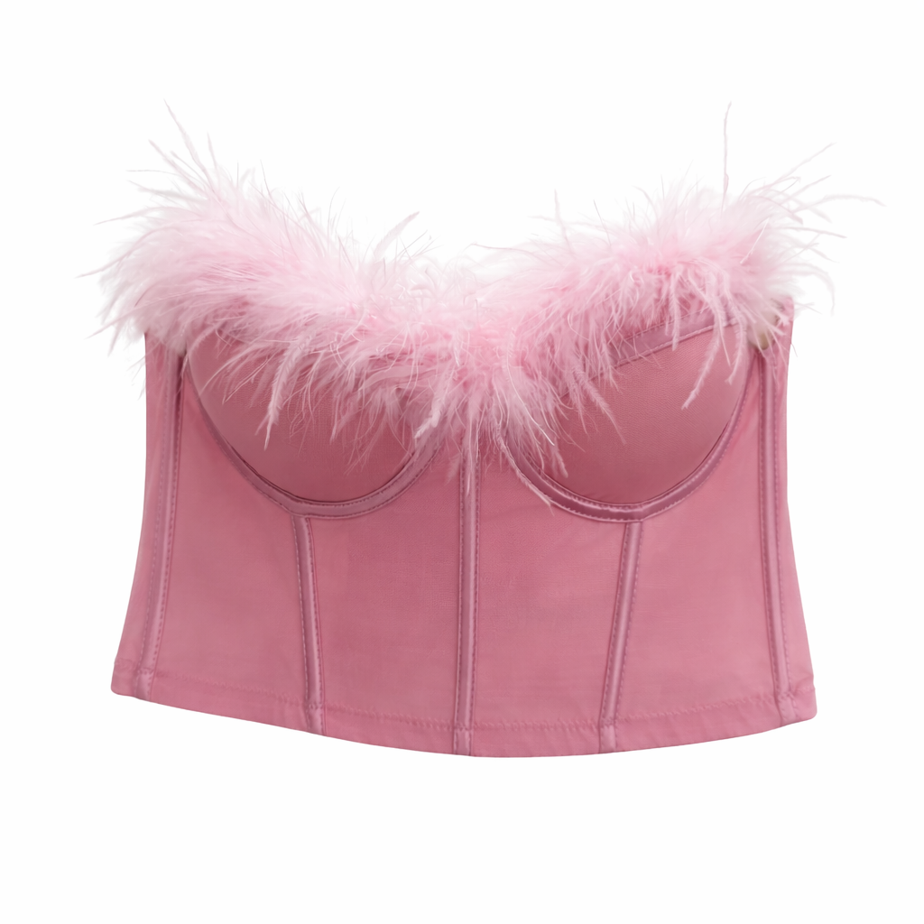 מחוך ורוד מהמם ומחמיא, עם קווים מחטבים ונוצות רכות באזור הכתפיים ליצירת מראה חושני,