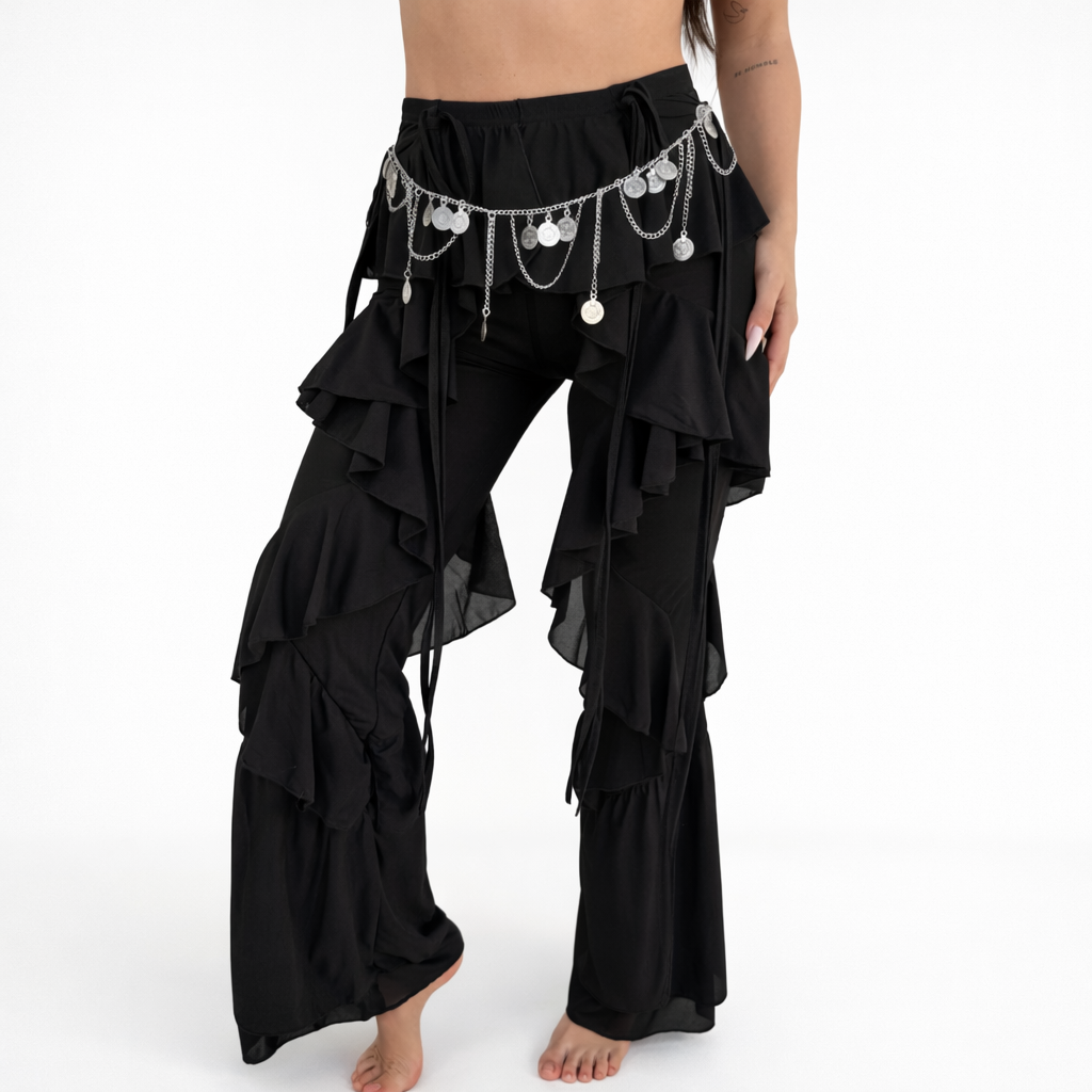 המכנס מושלם לשילוב עם טופים קצרים, תכשיטי גוף או אביזרי פסטיבל ליצירת לוק אופנתי, מסתורי ומלא אופי. פריט שמכניס תנועה, דרמה וסטייל ייחודי לכל הופעה.