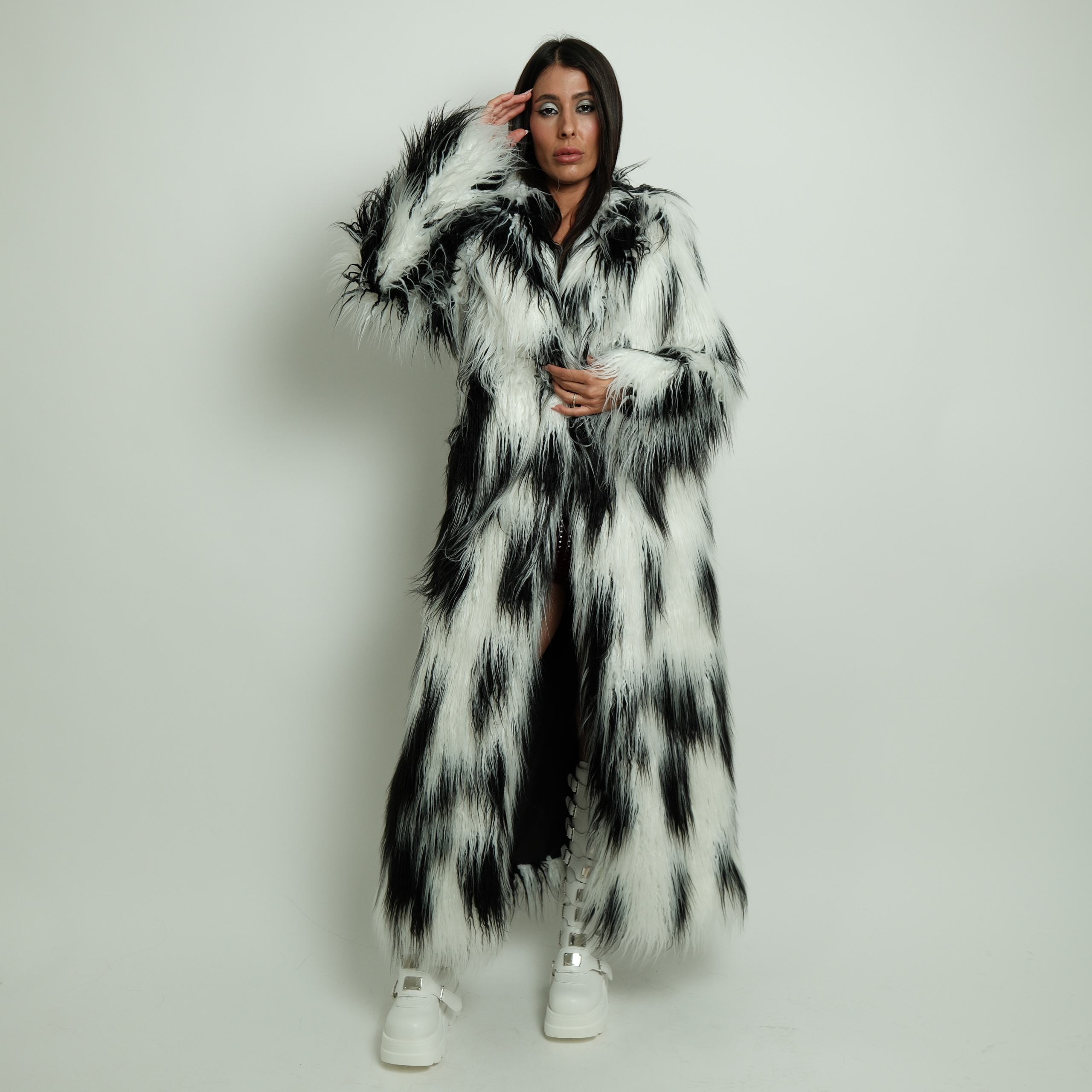 המעיל עשוי פרווה רכה ונעימה, בגזרה ארוכה היוצרת לוק דרמטי ובולט שמתאים לפסטיבלים, מסיבות, הופעות וצילומים.
