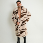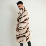 מעיל פרווה ארוך בעיצוב מודגש ודומיננטי עם דוגמה גרפית ייחודית וטקסטורה עשירה.