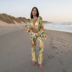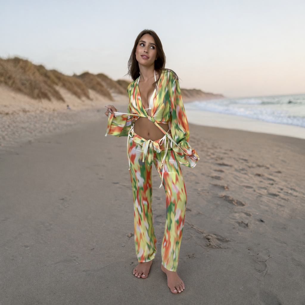 סט חוף 2 חלקים הכולל חולצת קשירה ומכנס ארוך, מבד קליל ואוורירי בהדפס צבעוני בגווני ירוק, כתום, צהוב ולבן.