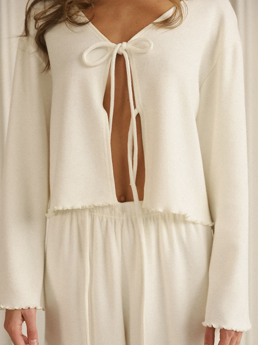 חלק עליון בגזרה משוחררת עם קשירה קדמית כפולה וגימורי קצה עדינים.