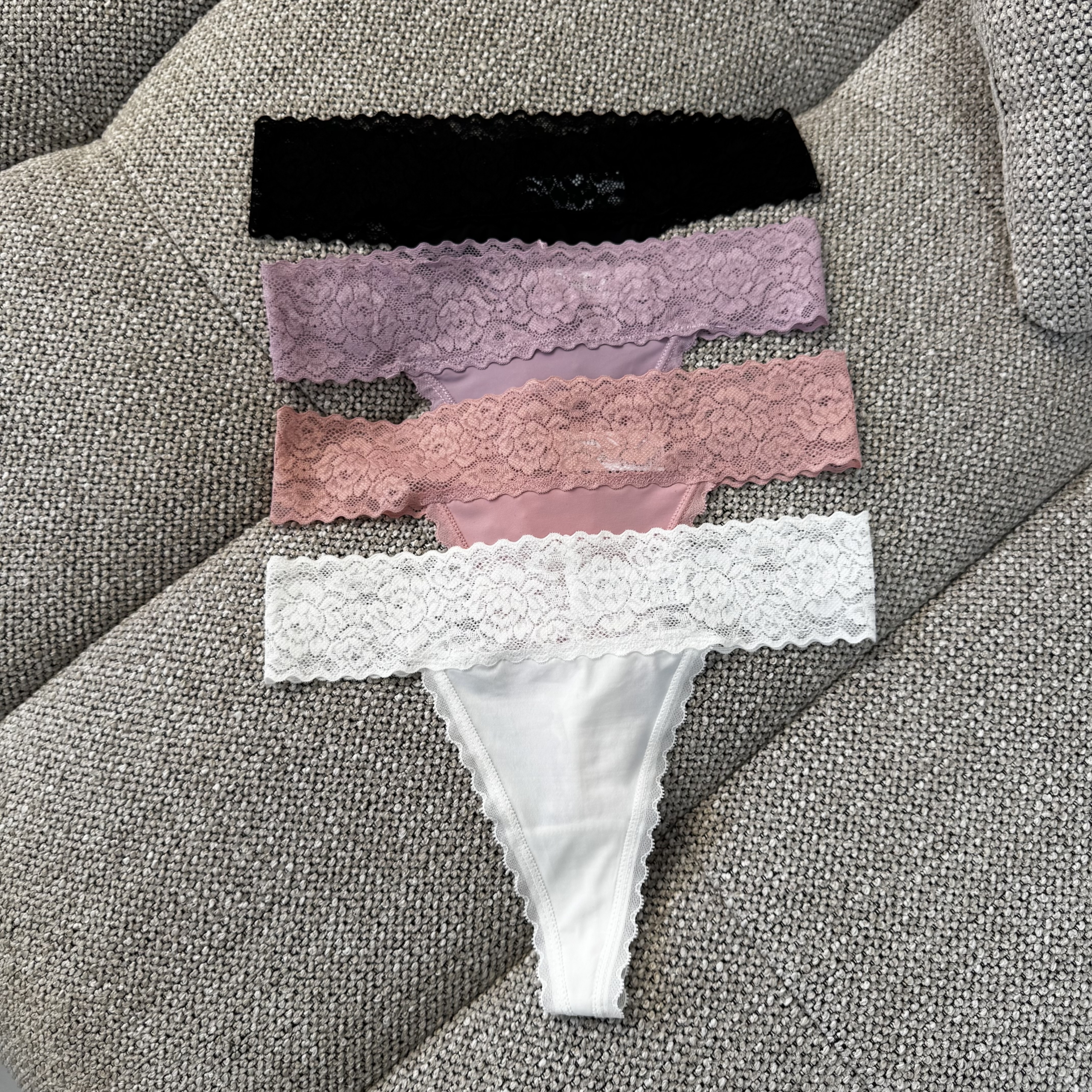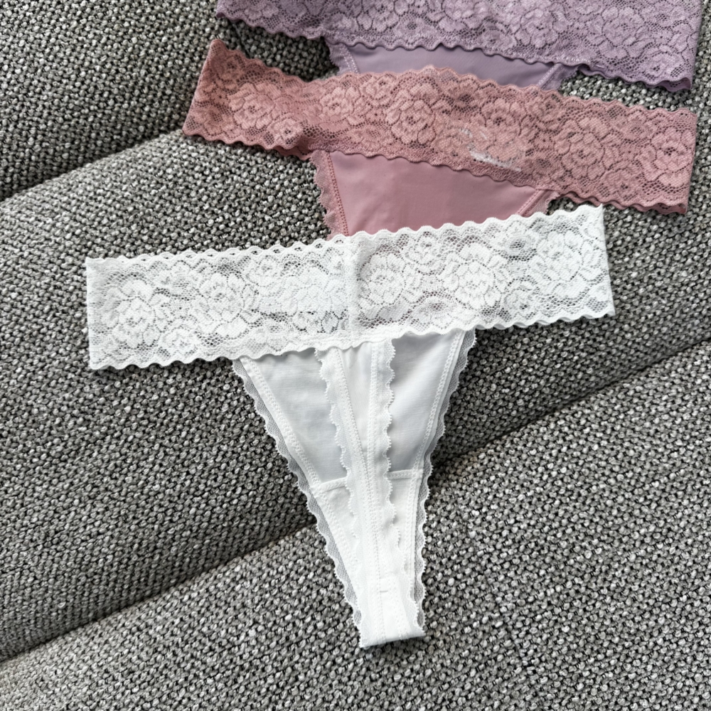 תחתון חוטיני קלאסי בעיצוב חלק ונקי, עם תחרה רחבה ורכה במיוחד בעלת דוגמת פרחים עדינה.
