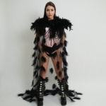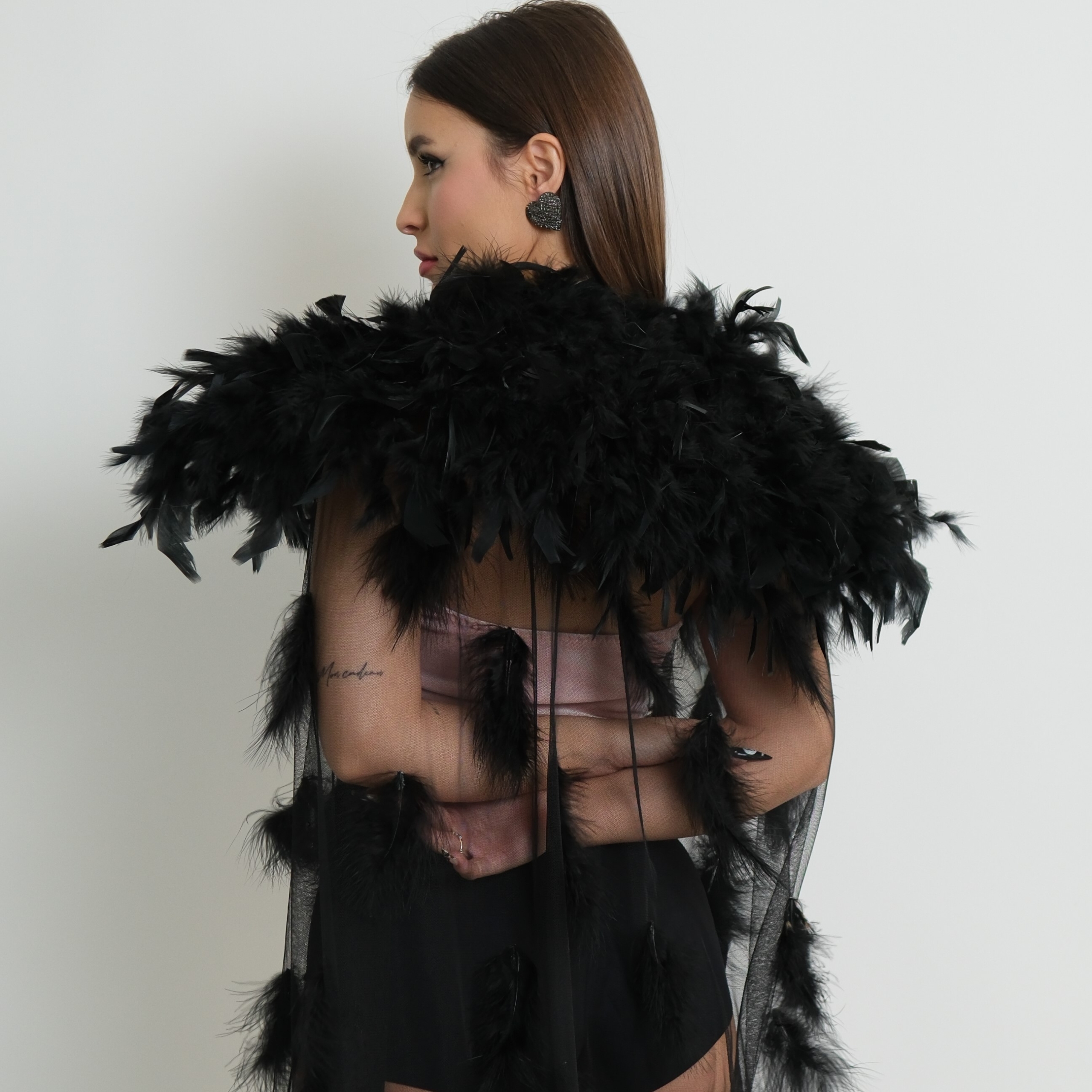 השל נסגר בצוואר ויושב על הכתפיים בצורה מחמיאה, מעניק נוכחות דרמטית ותחושת תנועה מרשימה בכל צעד.