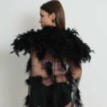 של פסטיבלים לבן בעיצוב ייחודי, משולב נוצות רכות וטול נשפך ליצירת מראה מלאכי ועוצמתי.