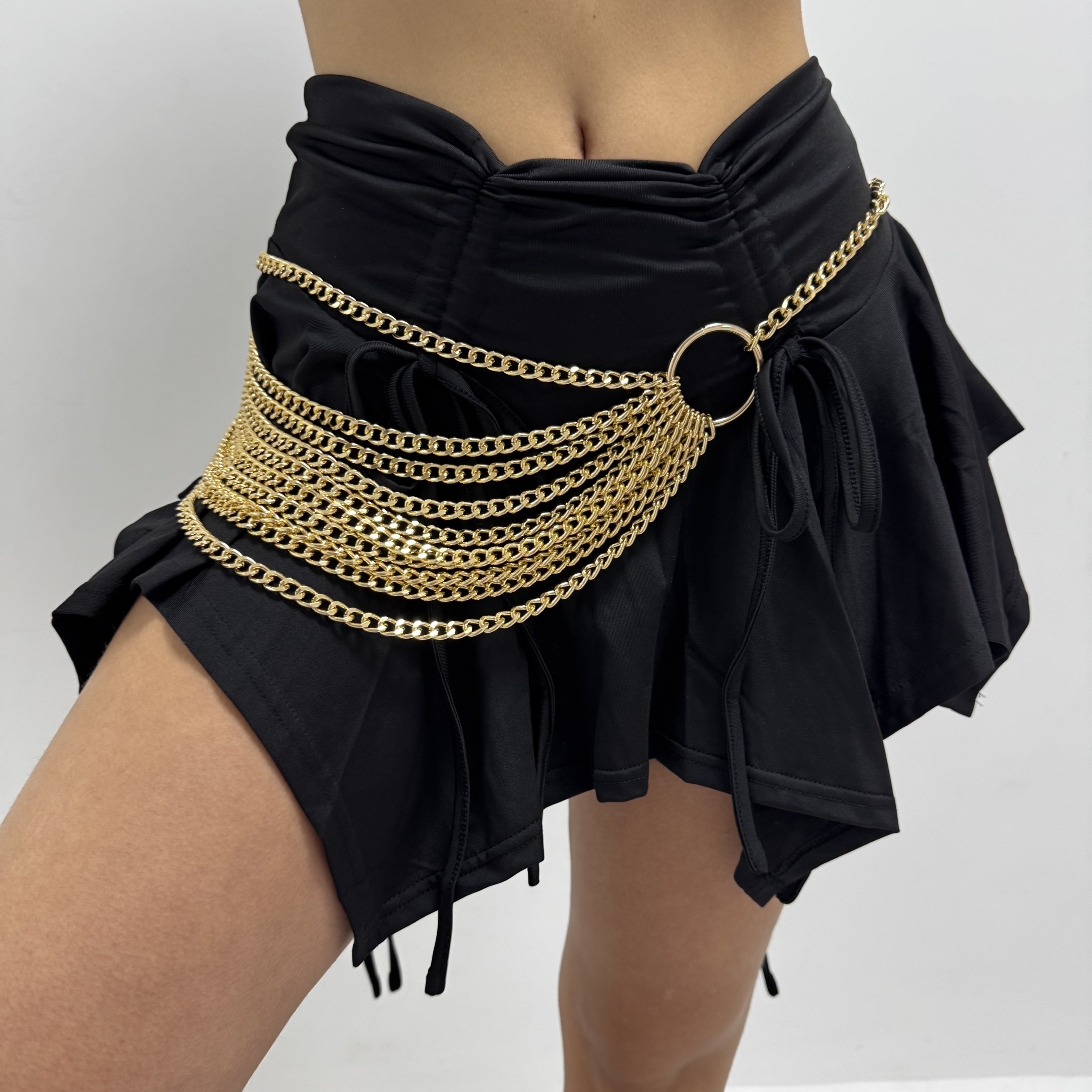 חגורת מותן בעיצוב שרשראות מתכת בשכבות עם חיבור טבעת צד החגורה יושבת בצורה מדויקת סביב המותן