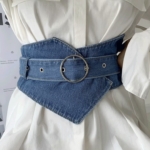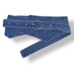חגורת מותן רחבה בעיצוב מודרני עם חיתוך אסימטרי ואבזם טבעת מתכתי מרכזי.