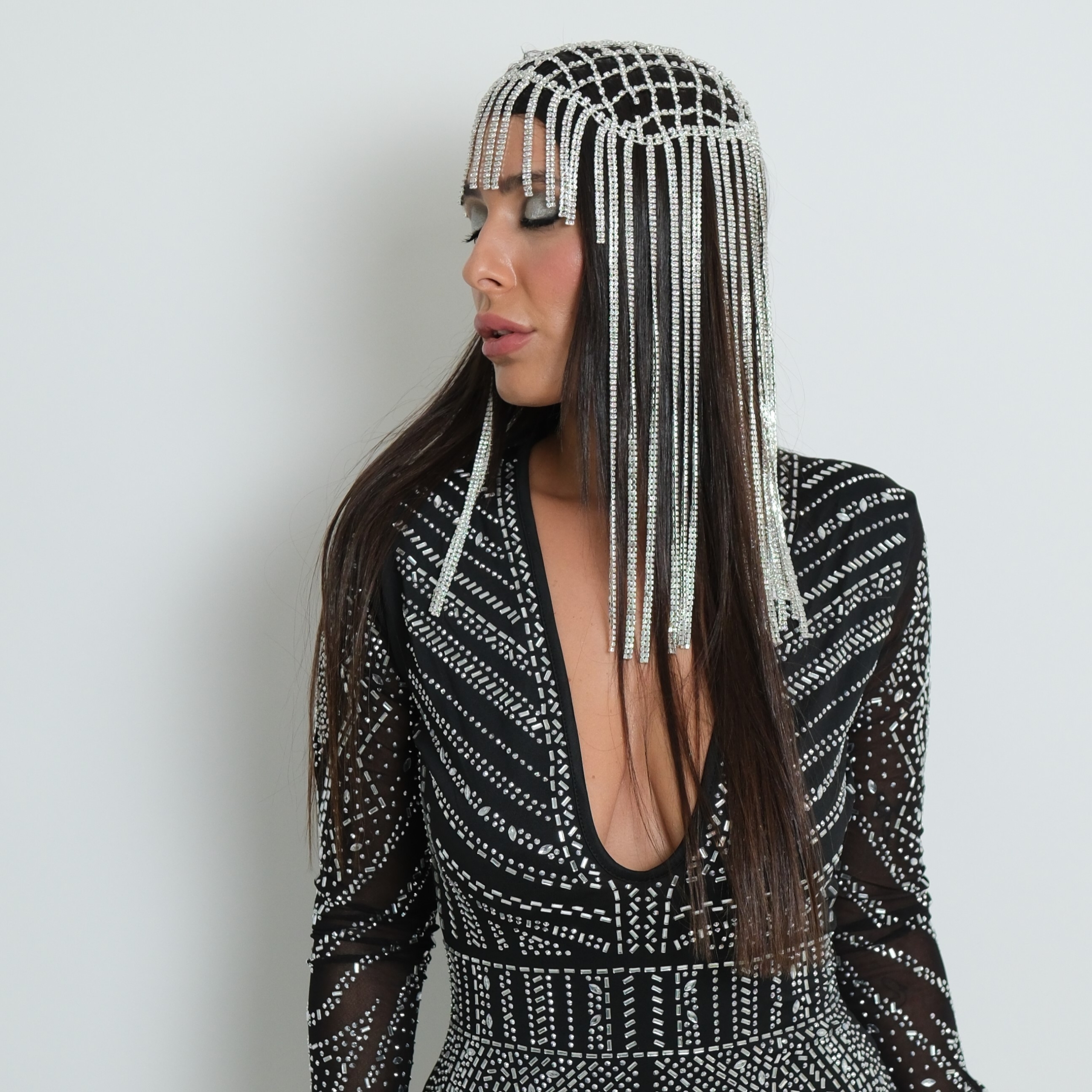 כיסוי ראש מרהיב בעיצוב יוקרתי המשלב רשת קריסטלים עדינה עם שרשראות נופלות ליצירת אפקט דרמטי וזוהר.