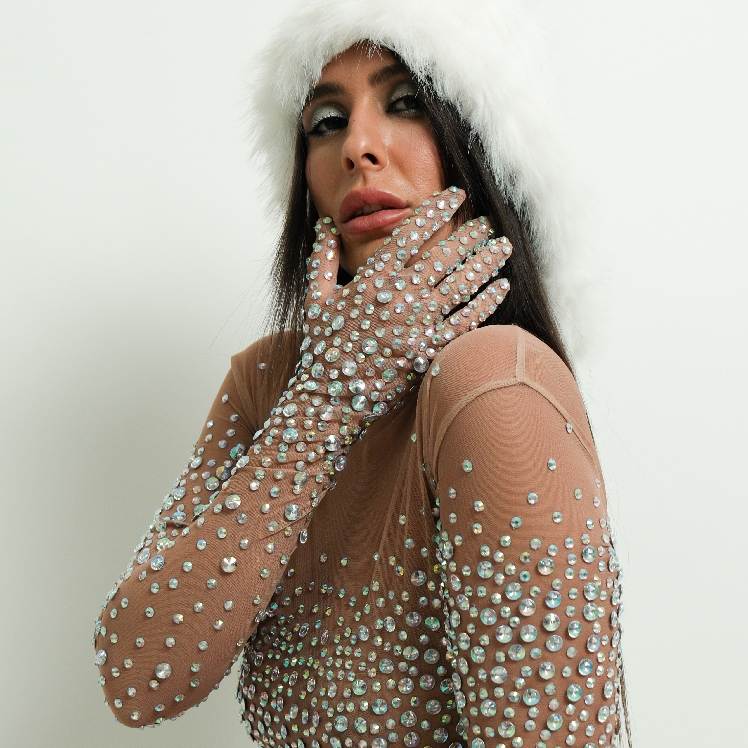 הגזרה הצמודה והאלסטית מחטבת את הגוף ומדגישה את הסילואט, עם שרוולים ארוכים וכפפות מובנות ליצירת לוק שלם, יוקרתי ובעל נוכחות.