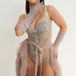בגד גוף פסטיבלי ייחודי בעבודת יד, עשיר באבני קריסטל ופנינים בשילוב בד רשת שקוף למראה זוהר ובולט.