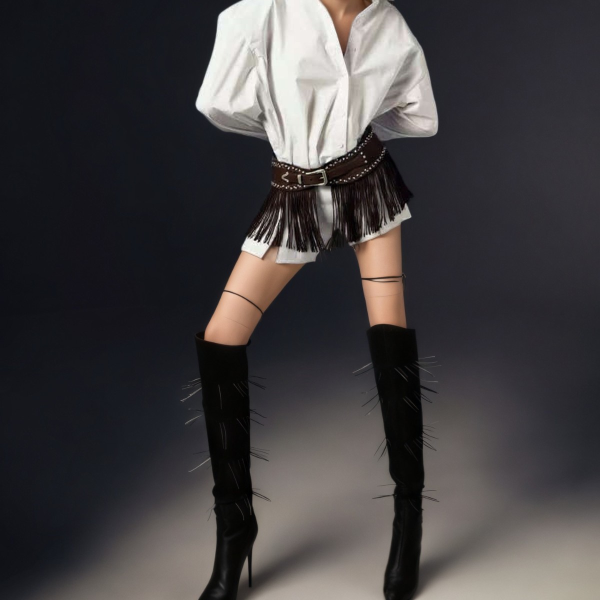 חגורת מותן רחבה בעיצוב מערב פרוע עם ניטים דקורטיביים ושוליים ארוכים לנוכחות בולטת.