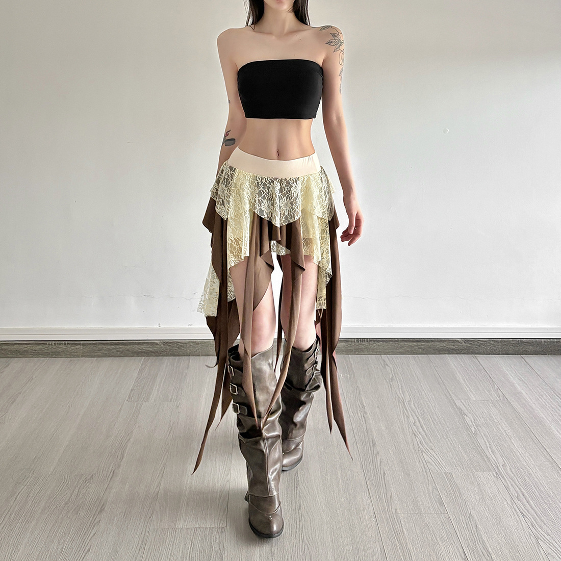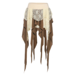 חצאית שכבות בסגנון בוהו־פסטיבל בגווני אדמה טבעיים, בשילוב תחרה עדינה ורצועות ארוכות שיוצרות תנועה ונוכחות מרשימה.