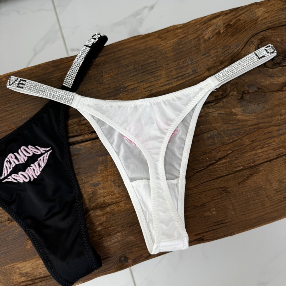 תחתון סטרץ' בגזרת חוטיני עם רצועות צד משובצות באבני קריסטל מבריקות.