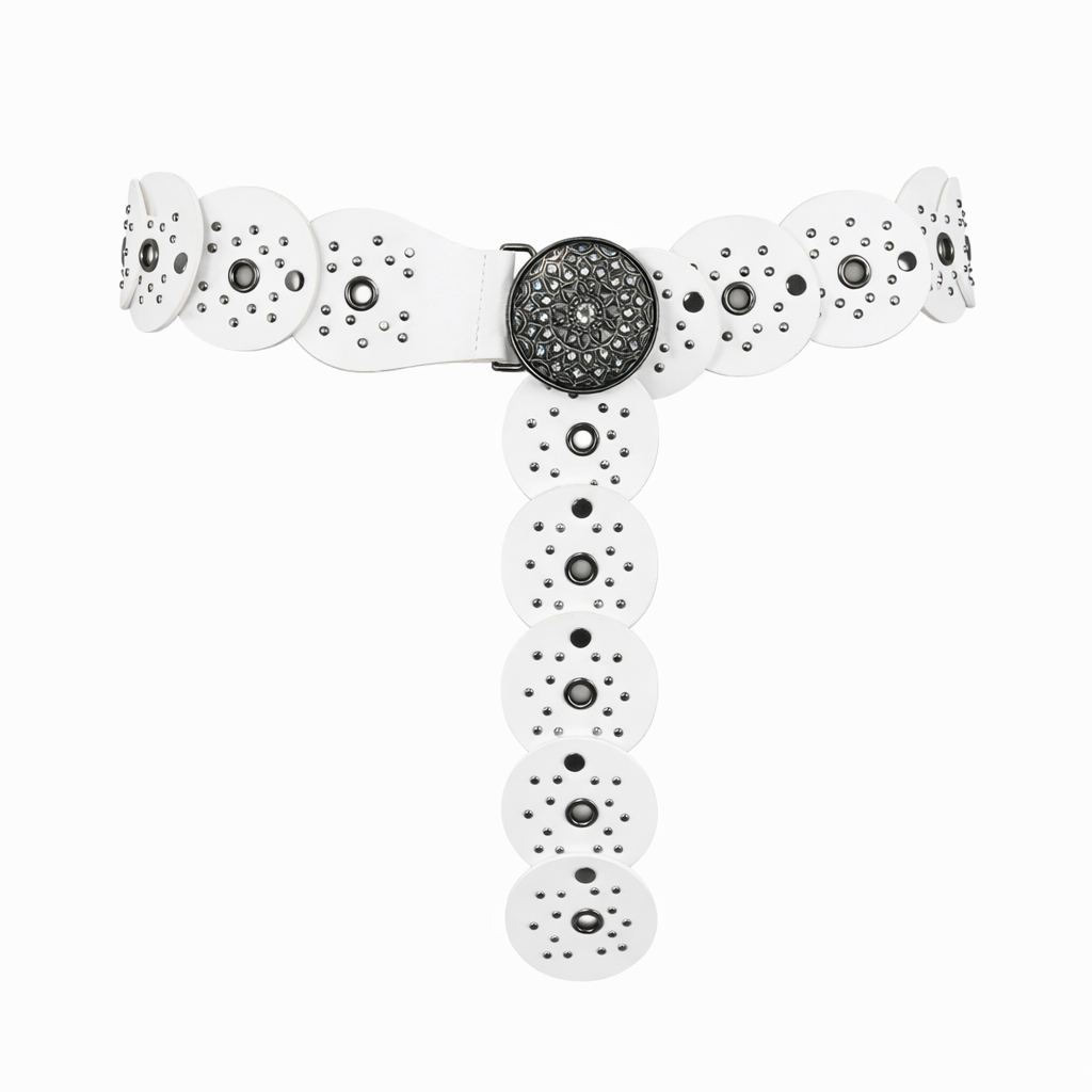 חגורת מותן בעיצוב דיסקים עגולים עם ניטים דקורטיביים ואבזם מרכזי.