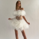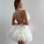 סט אלגנטי הכולל מחוך נוצות מעוצב עם שיבוצי קריסטלים בחזית וגב חשוף.