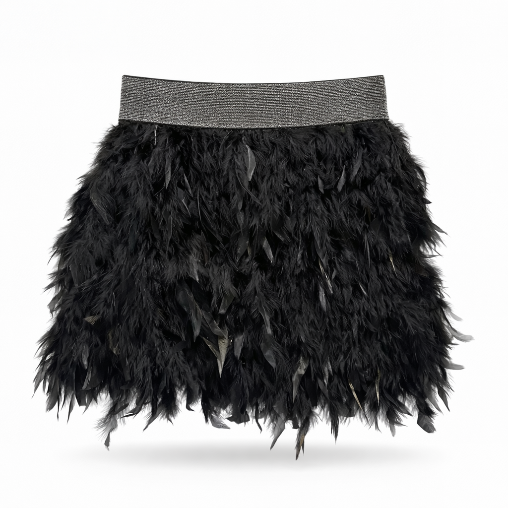 חצאית מיני מרשימה ומלאת נוכחות המעוצבת בשכבות נוצות רכות היוצרות מראה עשיר יוקרתי ותנועתי החגורה האלסטית בגימור מנצנץ מעניקה התאמה נוחה למותן ושומרת על מראה אלגנטי ומחמיא החצאית מושלמת לפסטיבלים מסיבות אירועים וצילומי אופנה ומשתלבת בקלות עם טופים מחוכים או בגדי גוף ליצירת לוק אופנתי בולט ונשי במיוחד הפריט מוסיף טאץ’ זוהר וייחודי לכל הופעה ומתאים למי שמחפשת לבלוט עם סטייל מלא נוכחות.