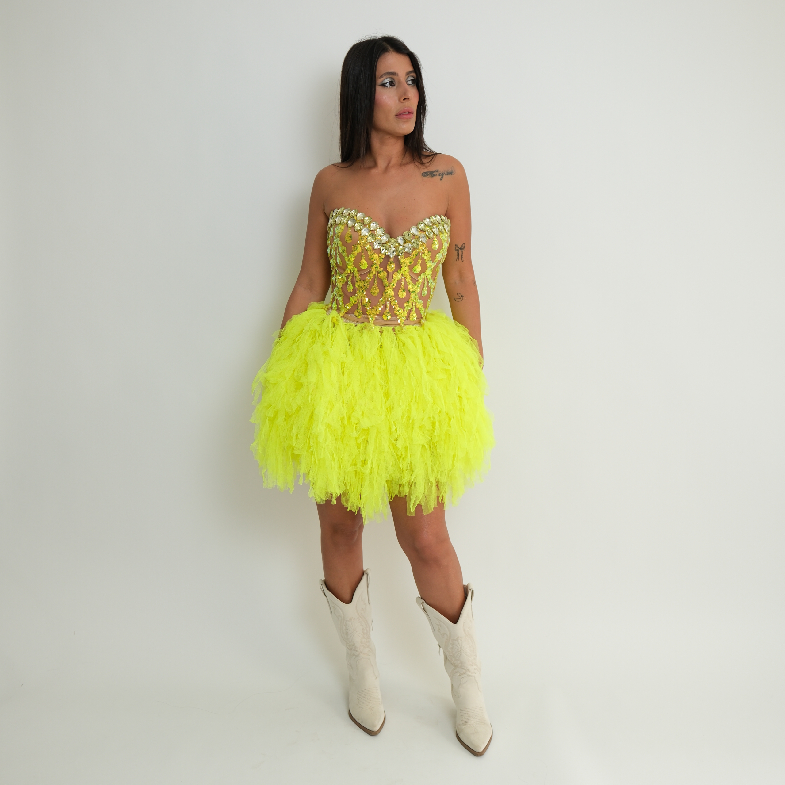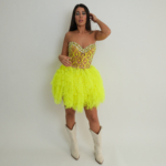 המחוך מעוצב בגזרת סטרפלס עם בסיס שקוף בשילוב רקמות ופאייטים בגוון צהוב-ליים מנצנץ ועיטור אבנים בחלק העליון להדגשת המחשוף.