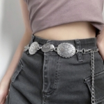 חגורת מותן בעיצוב מדליונים עגולים עם חריטות דקורטיביות וסגירת שרשרת מתכתית מתכווננת.