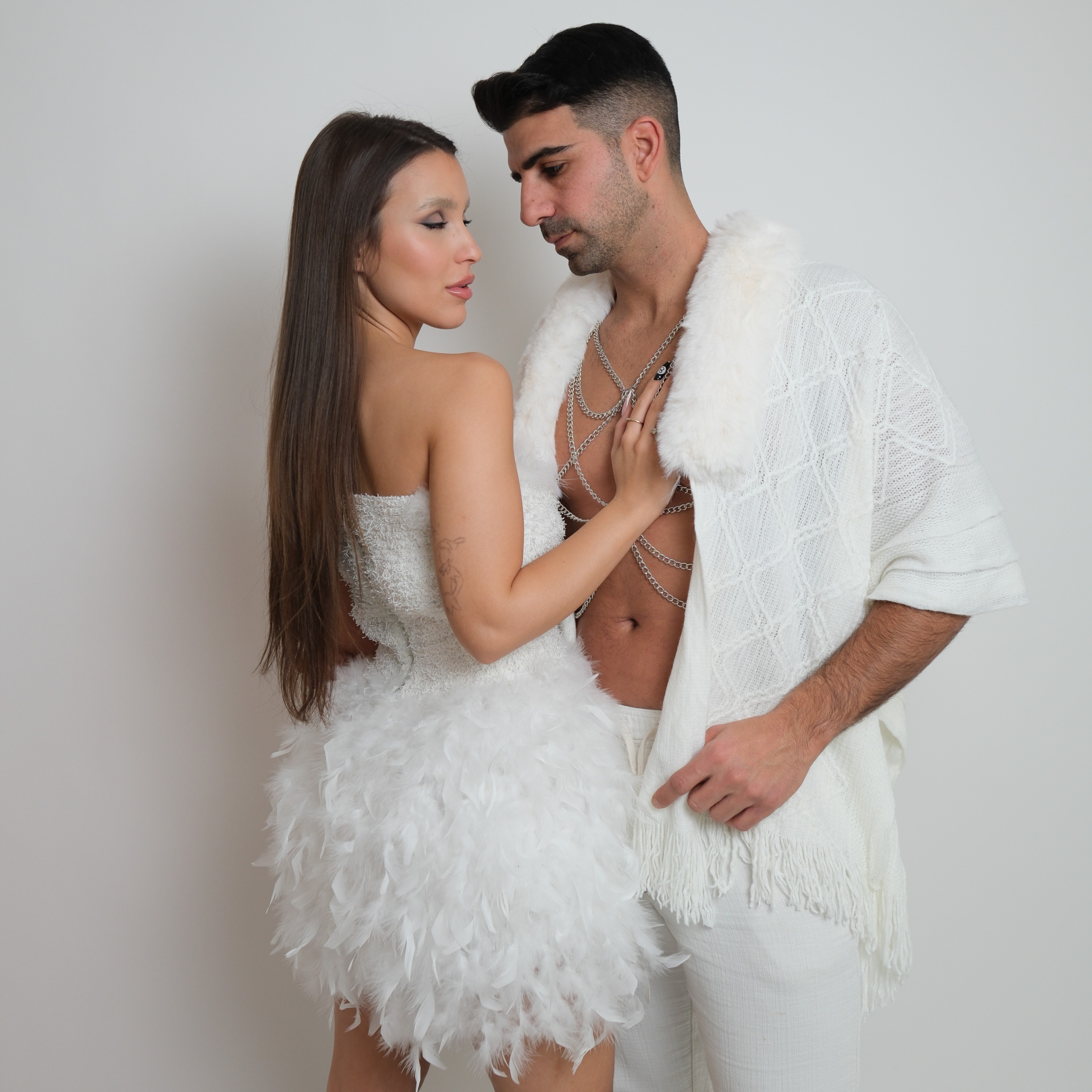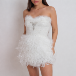 שולי השמלה מעוטרים בנוצות רכות ליצירת מראה דרמטי, חושני ומלא סטייל.