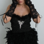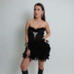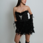 שולי השמלה מעוטרים בנוצות רכות ליצירת מראה דרמטי, חושני ומלא סטייל.