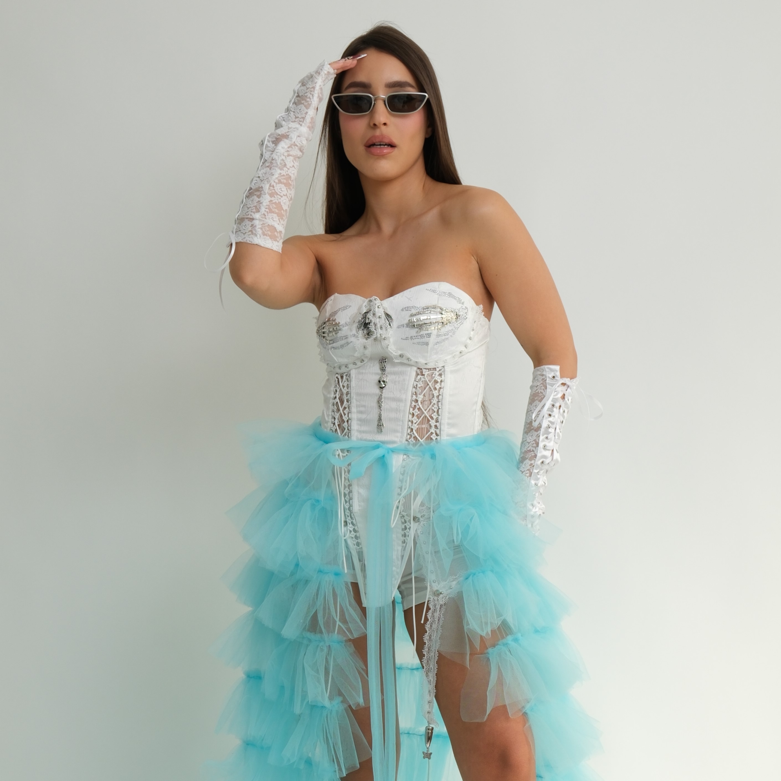 המחוך מעוצב בגזרת סטרפלז מחטבת עם שילוב תחרה ובד איכותי ליצירת מראה דרמטי ומדויק.