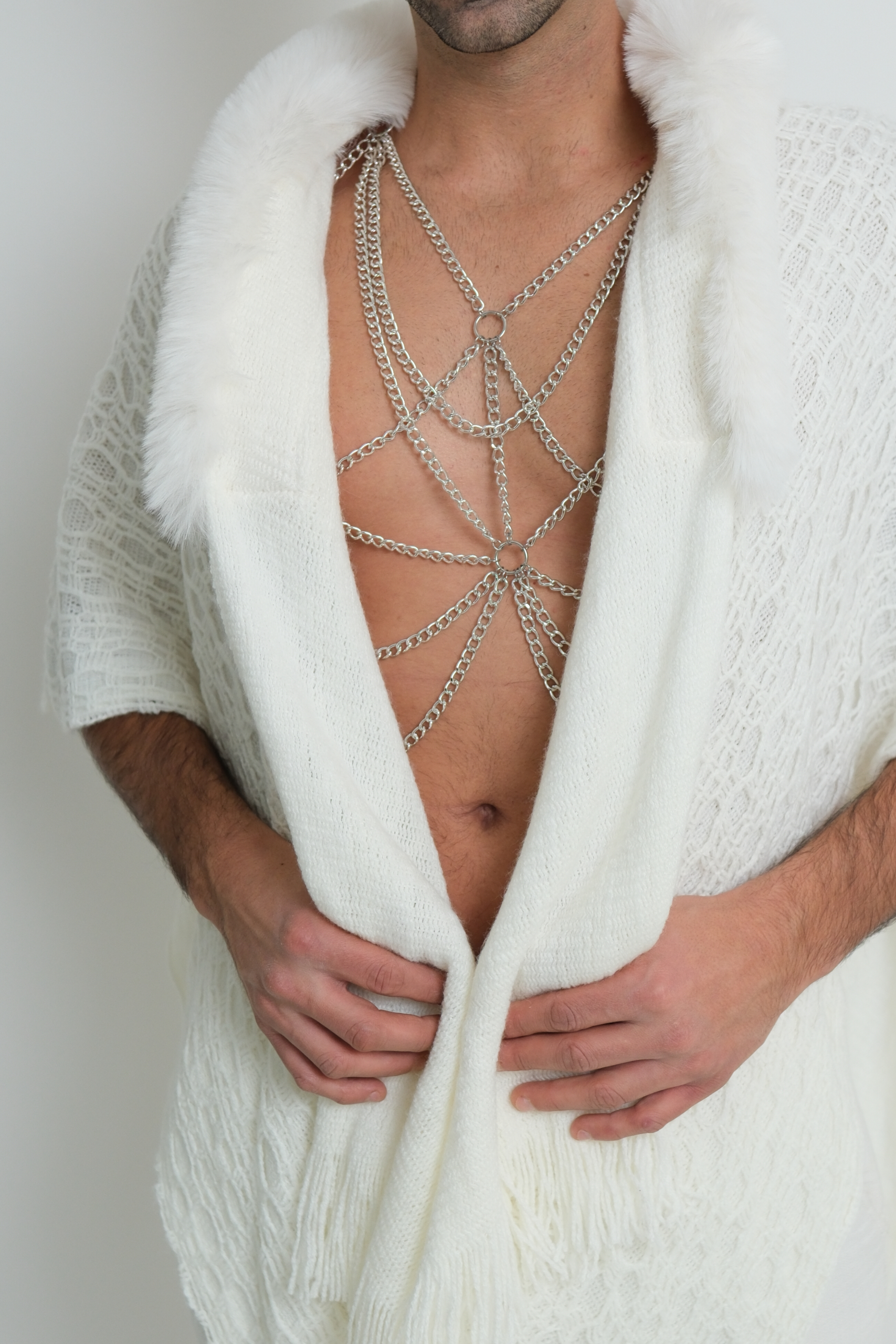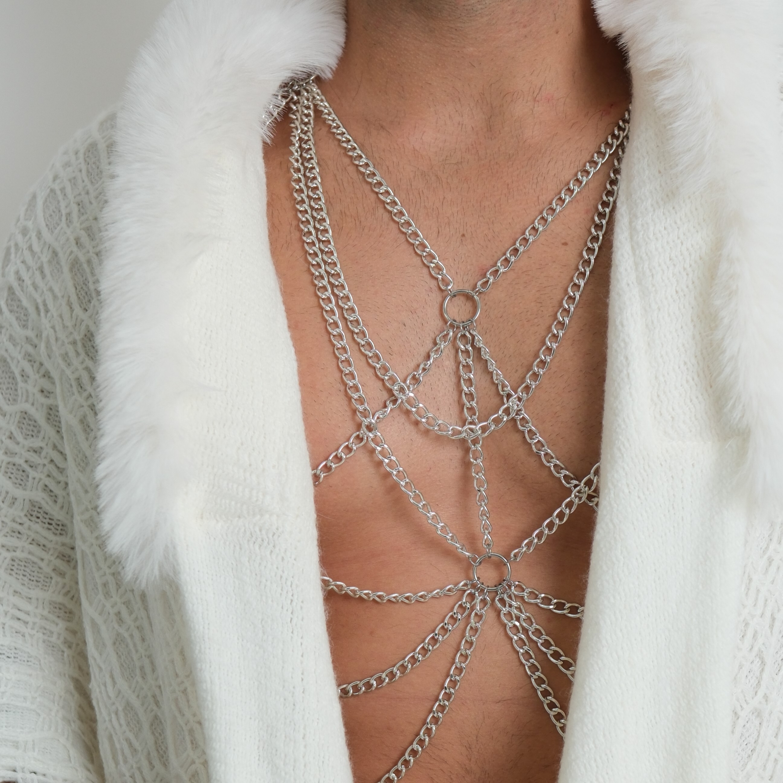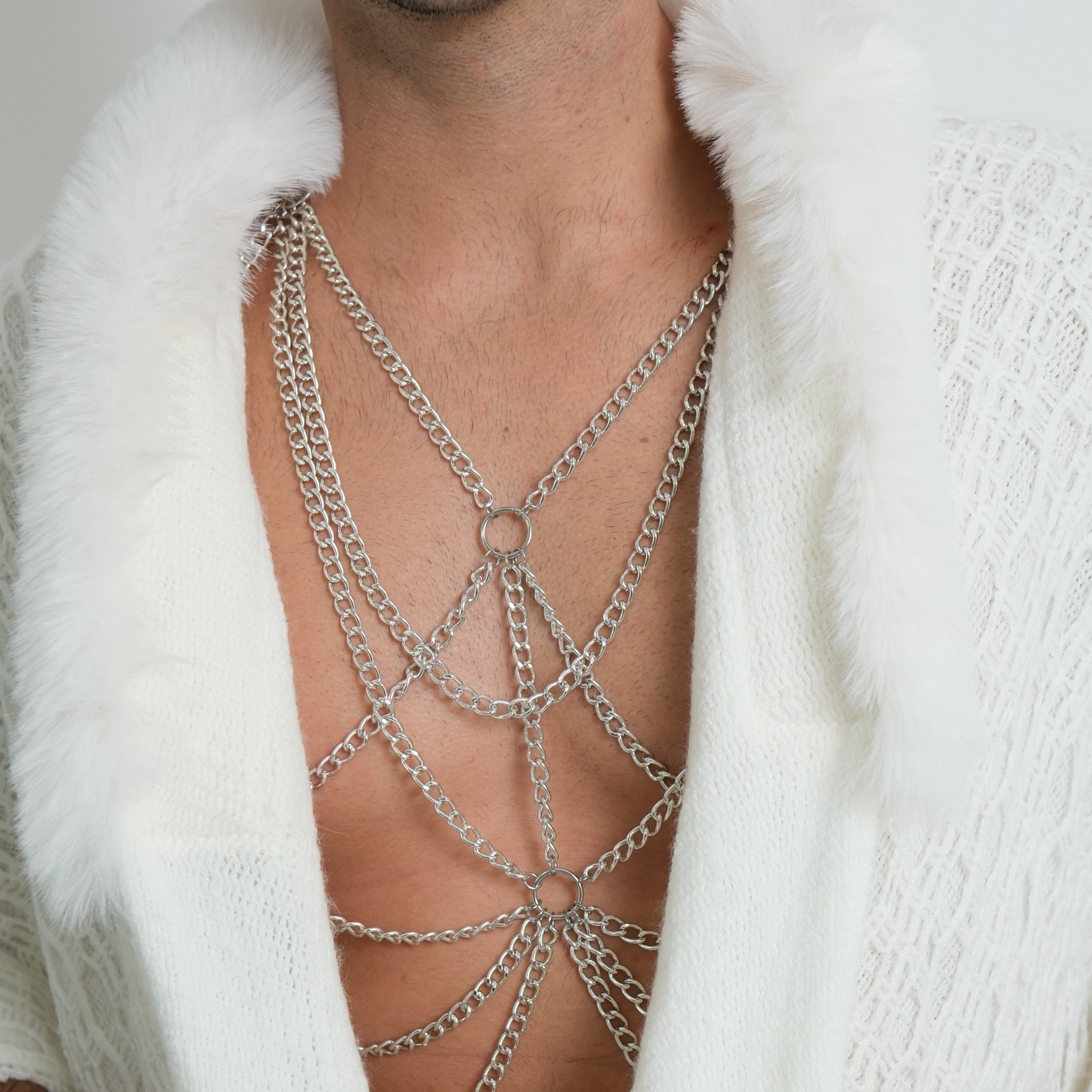 שרשרת גוף בעיצוב ייחודי עם מבנה רב־שכבתי המונח בצורה מדויקת על החזה והמותן.