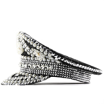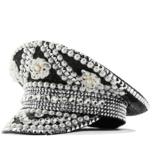 כובע סטייטמנט ייחודי בעיצוב עשיר ומרשים, משובץ פנינים, אבנים וניטים היוצרים שילוב מושלם בין אלגנטיות לגלאם נועז.