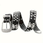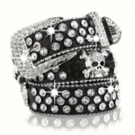 החגורה כוללת פרטי מתכת בולטים ועיטורי גולגולת בסגנון רוק־גלאם, עם אבזם כסוף משובץ באבנים להשלמת מראה דרמטי ומלא נוכחות.