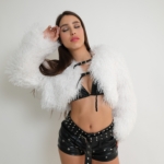 ג׳קט פרווה קצר בגוון לבן עם נוכחות חזקה ומראה פסטיבלי ייחודי.
