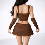 הסט כולל טופ מחוך בגזרת V עם שריכת חוט קדמית המדגישה את החזה והמותן, חצאית מיני תואמת בגזרה נמוכה עם טבעות מתכת דקורטיביות, וזוג שרוולי יד ארוכים להשלמת המראה.
